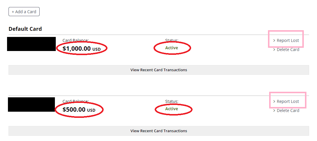 ちなみに、もし紛失した場合は右端の「Report Lost」から報告します。