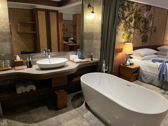 入室するといきなりバスタブが見え、客室の中心にバスタブが設置されている斬新なレイアウト。
