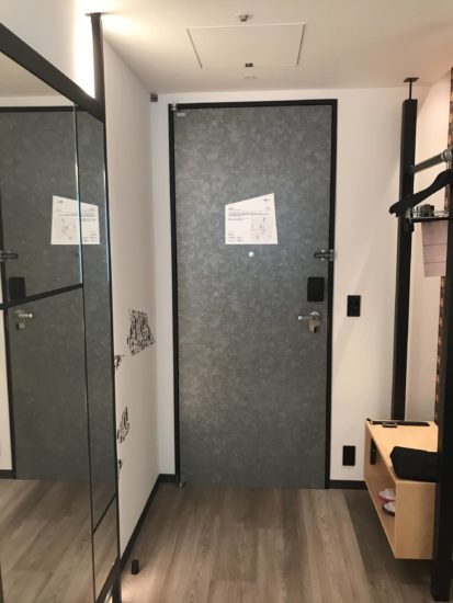 お部屋に入り左手にコート掛け、右側に全身鏡があります。