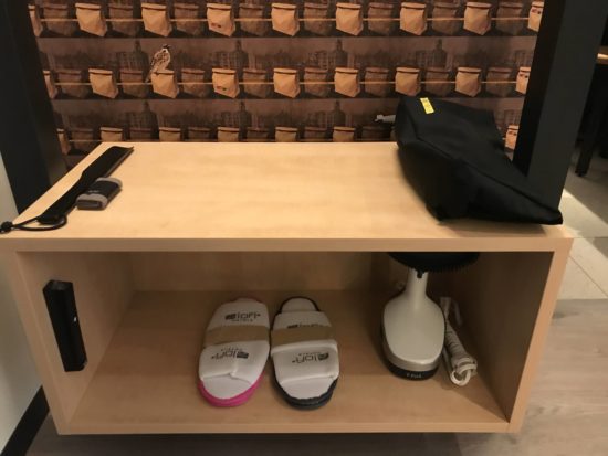 コート掛けの下には、スリッパとアイロン、靴磨きキットとドライヤー(黒い布袋内)