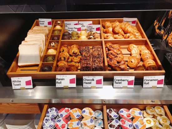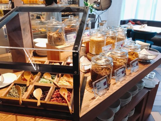セミブッフェはサラダ、フルーツ、ジュース、デニッシュ、シリアル、ドーナツなど。