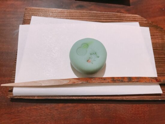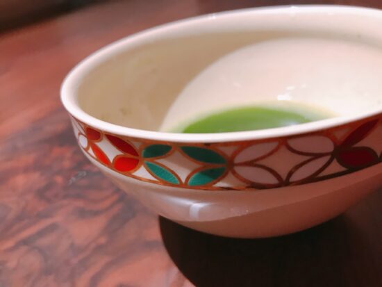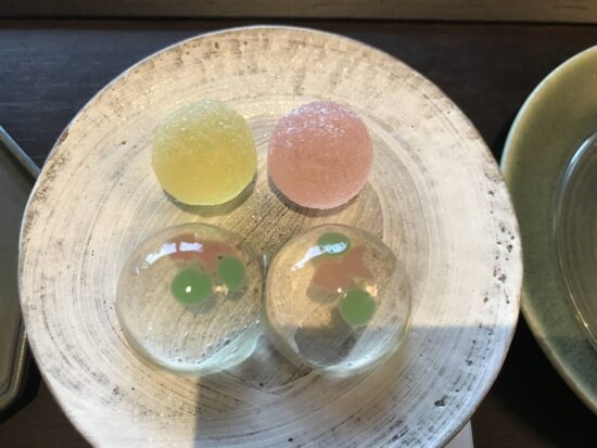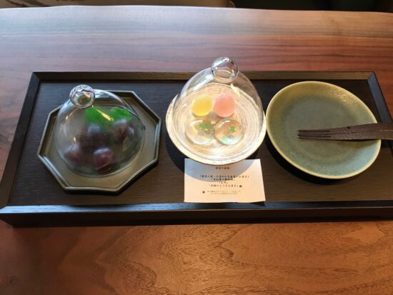 お庭に面したロビーへ案内され、トレイにセットされた冷たい緑茶とお上品なラムネをいただきながら、チェックインができます。