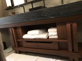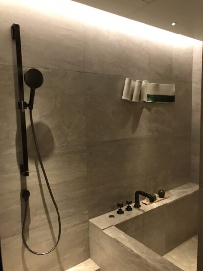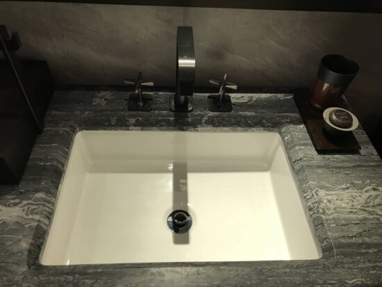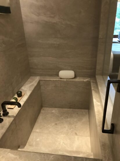 ダブルシンクの後ろ側にバスルーム。石造りのゴージャスなデザイン。オブジェにもこだわりがあります。