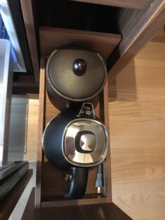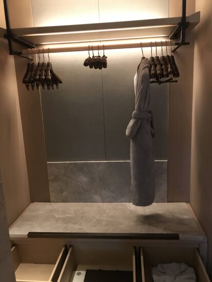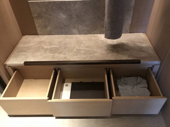 ウェットエリアの反対側には客室への通路がありますが、ちょっとした荷物を置いたりできるスペースがあります。