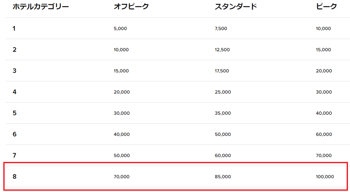 ポイント利用の無料宿泊には、70,000~100,000ポイントが必要となります。