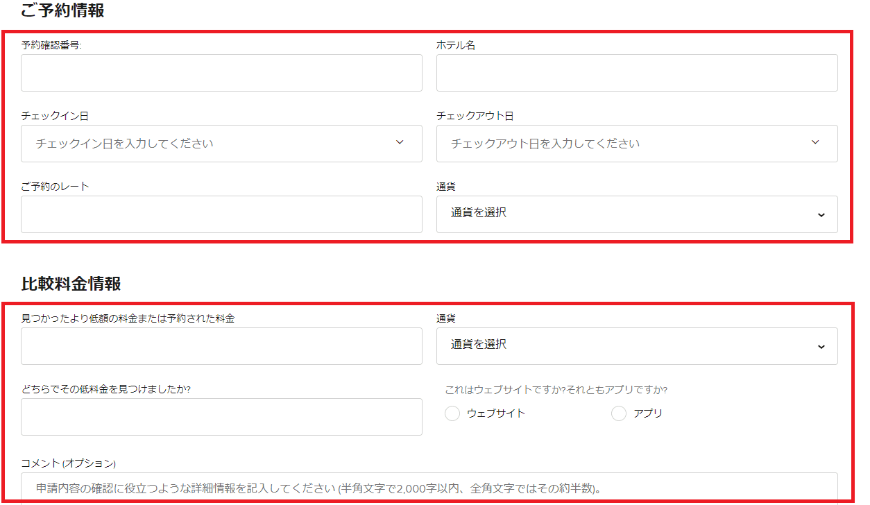 「ご予約情報」「比較料金情報」「リワードを選択」を漏れなく入力します。