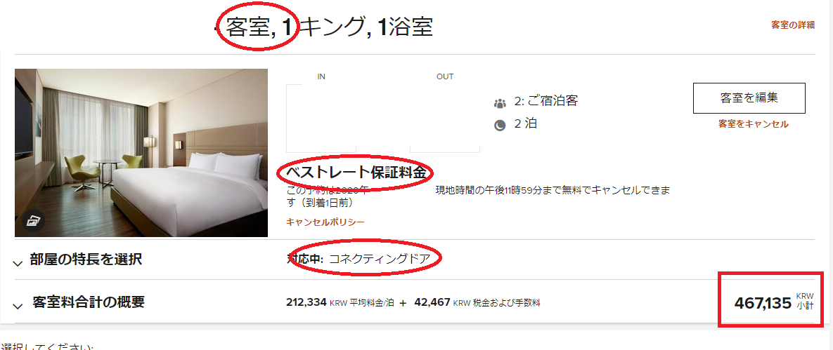 BRG成功25%オフ後の金額:467,137KRW2泊で42,467円になりました(1泊あたり1万円ほど安くなった)