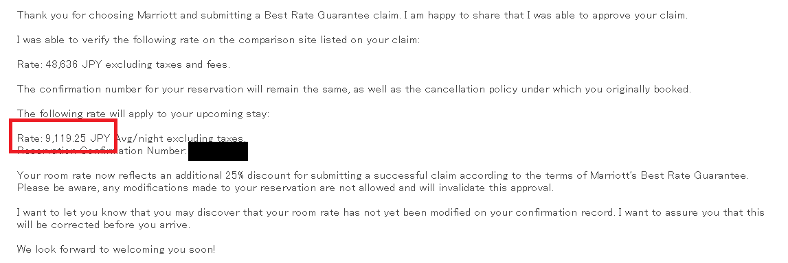 もし後から安いレートを見つけた場合は、改めてマリオット公式サイトから予約を入れ直して、ベストレート保証を申請すればOKです。