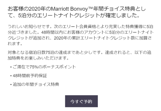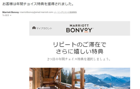 (こちらのメールは75泊達成後のメールですので、「2つ目の年間チョイス特典」と記載されています)