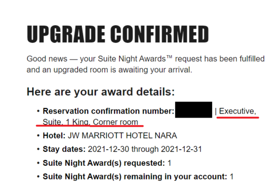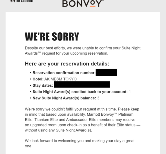 JWマリオットホテル奈良のとき、チタン夫とプラチナ私でSNAをそれぞれ申請しましたが、SNAが成功したのはプラチナの私だけでした。ステータスが優先されるとすれば、チタン夫の方が通るはずですから。
