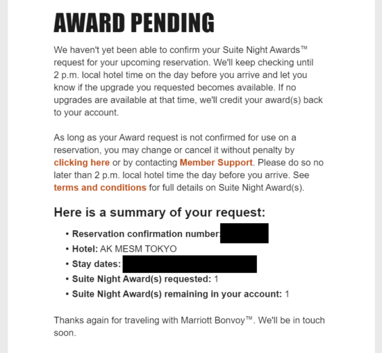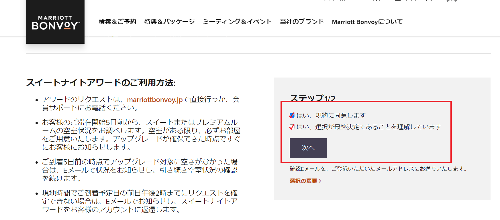 このような諸事情がある場合、もしくは宿泊予定があり、SNA申請(スイートルームへのアップグレード)を急ぐ場合は、マリオットからのメールを待たずに上記リンクから年間チョイス特典を申請することができます。