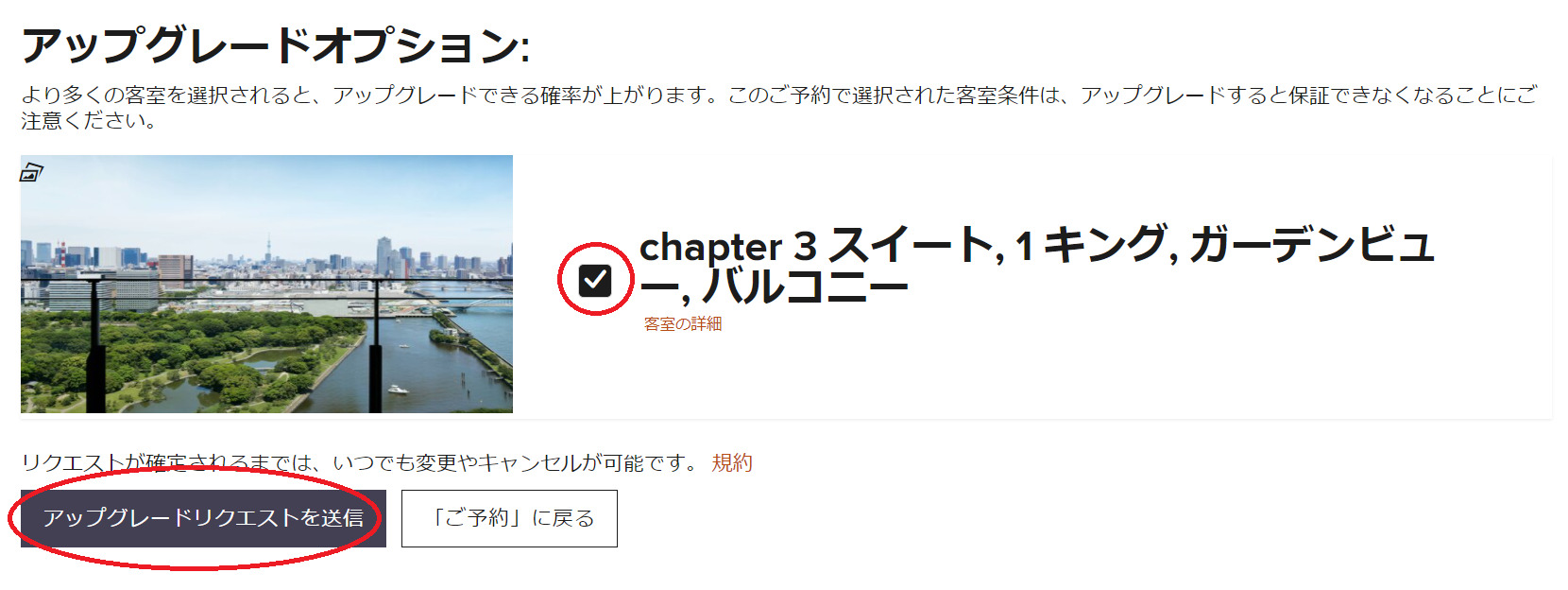 アップグレードの確率は上がりますが、プレミアムルームも含まれていますので、スイートを希望される場合は悩んでください(笑)