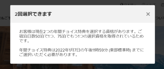 ※私の場合、2021年度の特典をまだ選択していなかったので、下記の通り「2回選択できます」とメッセージが表示されました。