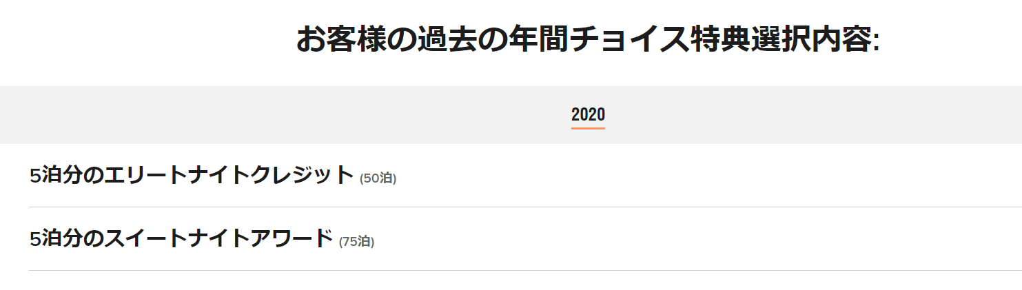 例えば、2020年度に年間チョイス特典を獲得した場合は、2020年度の宿泊実績に5泊加算されます。
