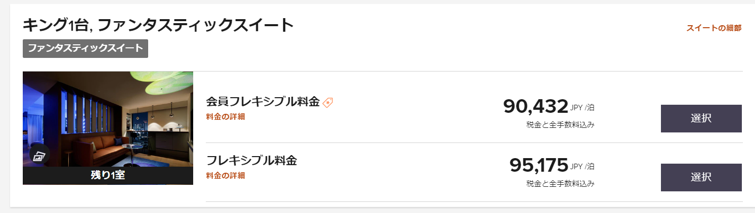 メズム東京では、チャプター3のスイートルーム1室しか表示されませんが、ホテルによっては10種類ほど客室が表示されます。