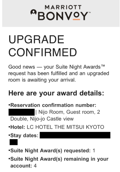 SNAが通りやすいと噂の三井京都では、宿泊1週間前には「SNA成功→ニジョウルームにアップグレード」されたメールが届きました。
