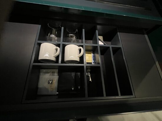 下の引き出しにはカップ類、お茶やコーヒーがあります