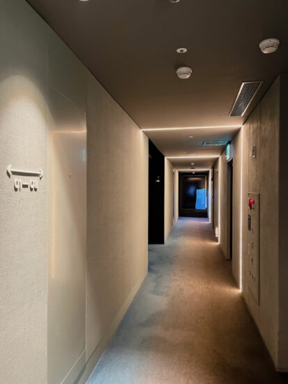 RYSEは全体的に照明が暗い。エレベーターを下りたところ、廊下も暗いです。