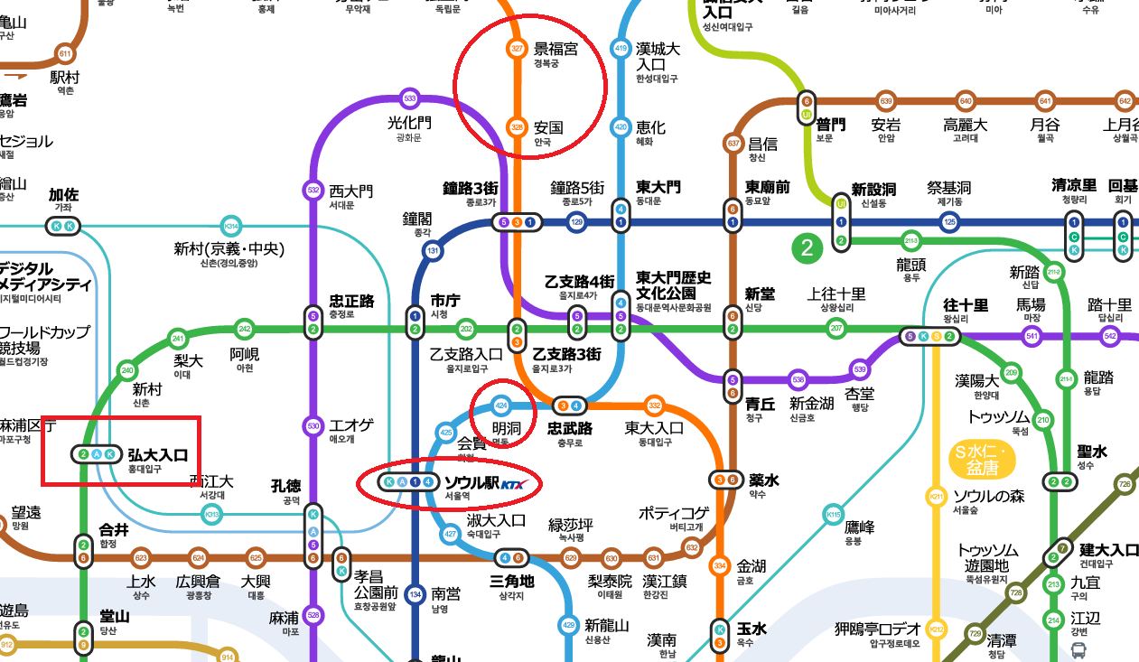 赤〇枠がソウル駅、明洞駅、観光で人気の安国や景福宮
