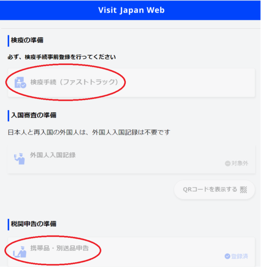登録する項目は「検疫の準備」と「税関申告の準備」の2つです。