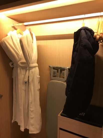 客室に入ると、右側にバスルーム、その先にクローゼット、突き当たりに寝室があります(写真は反対側から撮影しています)