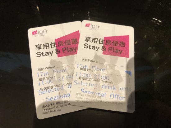 17階の「W XYZ」バーで利用できるウエルカムドリンクのチケットを2枚いただきました。