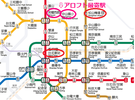 また1駅隣の「民権西路」駅からは観光に便利な淡水信義線(レッドライン)に乗ることができます。ホテルから徒歩5分程度です。