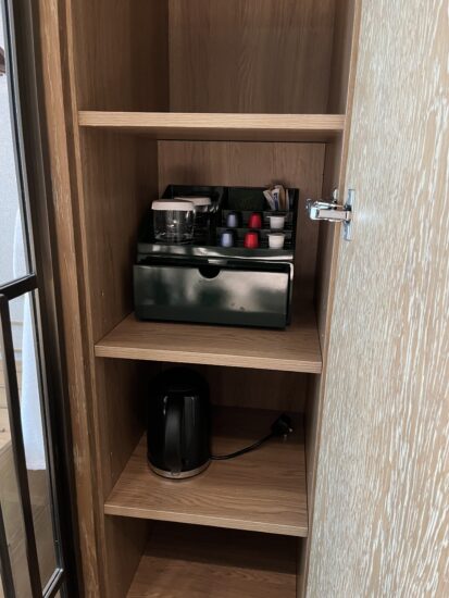 トイレの隣の扉にカップ類やポットが収納されています。